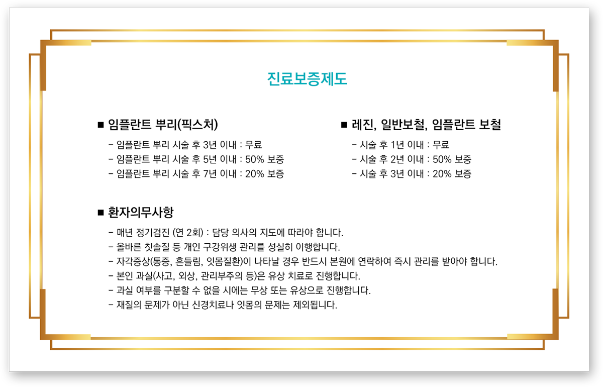 임플란트 치료가 완료된 환자분들을 대상으로 3~6개월 간격으로 정기검진 일자를 문자메세지로 안내해 드립니다.