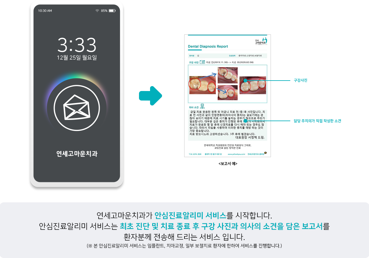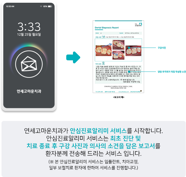 치료 종료 시 최초 구강 사진과 치료 완료 후 사진과 함께 주치의의 소견을 담은 보고서를 환자분께 전송해 드립니다.